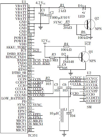 。由于該模塊電源引腳有5個,且電壓都是3.3~4.8V,因此本設(shè)計(jì)將5個引腳連在一起,直接接到外部4.2V電源上。但是本系統(tǒng)的外部電源是12V的直流電流,所以設(shè)計(jì)時采用LM2941穩(wěn)壓為4.2V.GPRS模塊上的引腳IGT主要是用于點(diǎn)火復(fù)位,其作用是作為GPRS模塊的一個復(fù)位轉(zhuǎn)換系統(tǒng),加電后為使TC35I進(jìn)入工作狀態(tài),必須給IGT加一個大于100ms的低脈沖,電平下降持續(xù)時間不可超過1ms,這里通過RC電路來實(shí)現(xiàn)。TC35I的第32腳SYNC引腳有兩種工作模式,一種是指示發(fā)射狀態(tài)時的功率增長情況,另一種是指示TC35I的工作狀態(tài),可用AT命令A(yù)T+SYNC進(jìn)行切換,本模塊使用的是后一種。GPRS模塊和單片機(jī)之間的數(shù)據(jù)通信主要是通過端口TXD0與TXD之間、RXD0與RXD之間的數(shù)據(jù)傳輸來完成。其中,GPRS模塊上的TXD0口用于接收從單片機(jī)傳來的數(shù)據(jù),而單片機(jī)上的TXD端口用于向GPRS模塊傳送數(shù)據(jù)。GPRS模塊上的RXD0口用于向單片機(jī)發(fā)送數(shù)據(jù),單片機(jī)的RXD口則用于接收從GPRS模塊傳輸來的數(shù)據(jù)。在TC35I的基帶處理器上有一個綜合SIM接口,該接口直接接線到主機(jī)接口(端到端連接器),用于連接到外部的SIM卡座。本系統(tǒng)接的SIM卡有CCCLK、CCVCC、CCIO、CCRST、CCIN、CCGND