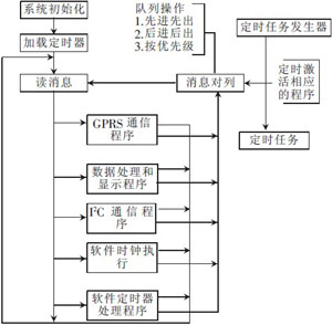 該下位機(jī)軟件設(shè)計(jì)包括主程序、顯示子程序和通信服務(wù)程序的設(shè)計(jì)。主程序主要完成中斷的初始化和串口的初始化設(shè)置。顯示程序主要完成數(shù)據(jù)的各種顯示,顯示部分采用動態(tài)掃描的方式,實(shí)現(xiàn)對顯示屏要顯示的漢字、圖像、字符等數(shù)據(jù)信息進(jìn)行傳輸控制以及顯示等功能。通信服務(wù)程序主要完成GPRS的數(shù)據(jù)接收、數(shù)據(jù)的分割處理、數(shù)據(jù)的發(fā)送等任務(wù)。本文采用模塊化程序設(shè)計(jì),程序各部分的功能由各個模塊分別實(shí)現(xiàn)。程序模塊有:系統(tǒng)初始化模塊、GPRS通信模塊、數(shù)據(jù)的處理和存儲模塊、I2C通信模塊。為了保證系統(tǒng)工作的實(shí)時性和高效性,本系統(tǒng)采用了實(shí)用單片機(jī)系統(tǒng)MS3,MS3是一套針對MCU51的開發(fā)平臺,借簽了VC編程的消息機(jī)制,把各個功能有效地組織起來。RTOS的系統(tǒng)時鐘,實(shí)現(xiàn)高效的按鍵掃描和快速的響應(yīng)中斷,執(zhí)行例行程序。顯示終端主程序如圖所示。