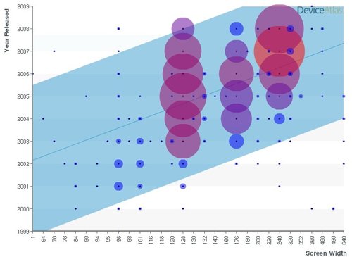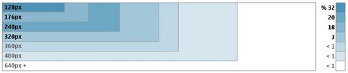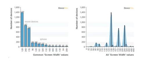 還有一點,不到5%的設(shè)備寬度大于320個像素。但這一數(shù)字可能會在未來有所提升,目前已經(jīng)可以看到,小屏幕(128,176等)設(shè)備正逐漸被大屏幕(240+)設(shè)備所代替。下面的圖表給出了相關(guān)的分析。