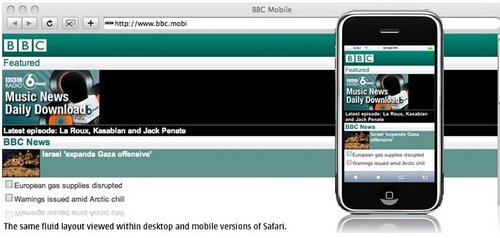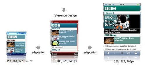 BBC還可以為特定的設(shè)備(或是一組設(shè)備)重新編排一些內(nèi)容。iPhone有非常豐富的功能,因此iPhone版的BBC還有音樂下載選項,而其他的設(shè)備可能只會顯示今天最熱門的‘BBC新聞’?梢愿鶕(jù)數(shù)據(jù)的大小,多媒體的處理能力甚至是屏幕的尺寸決定是否需要針對iPhone提供更加豐富的內(nèi)容。以Nokia 6680上的‘特色’顯示為例,它大部分的顯示內(nèi)容是讓用戶滾動屏幕查看今天最熱門新聞故事。iPhone上顯示了三個新聞故事,而其中只有一篇配有插入。這使得用戶無需滾動屏幕就可以大致了解全部的咨詢。