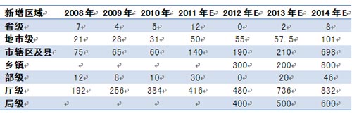 國家“十一五”規(guī)劃要求應急建設覆蓋到省級,“十二五”要求覆蓋到村級。據(jù)調(diào)研,政府省級應急平臺建設一般需2000萬元;地市級500~1000 萬元;市轄區(qū)及縣級在100萬;鄉(xiāng)鎮(zhèn)級50萬。而根據(jù)行政區(qū)域劃分,綜合指揮調(diào)度系統(tǒng)一般占應急平臺投資的5%-20%。目前,我國政府應急平臺建設覆蓋到省級、部分地市級及少量縣級,大量的縣級市及縣級、鄉(xiāng)鎮(zhèn)級并未覆蓋,而且之前的投入多以硬件系統(tǒng)集成為主,后續(xù)有很大的建設的空間。
