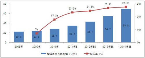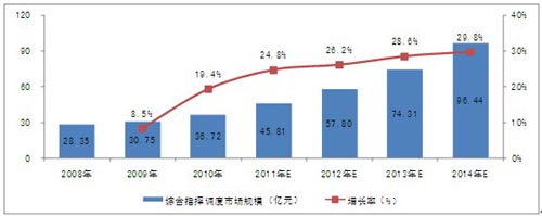 根據(jù)對下游行業(yè)的調(diào)研和關(guān)聯(lián)市場的分析,2010年,中國指揮調(diào)度市場規(guī)模已達到28.1億元。隨著下游行業(yè)投資規(guī)模的擴大、產(chǎn)品的升級換代及技術(shù)的發(fā)展,行業(yè)市場規(guī)模將保持較快的增長速度,未來4年的復合增長率為26.31%,2014年,市場規(guī)模將達到69.8億元。