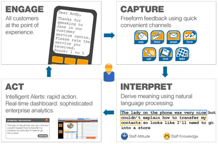 該應(yīng)用軟件能夠捕捉所有聯(lián)絡(luò)渠道上任何形式的客戶反饋;包括文本,郵件,電話,網(wǎng)絡(luò)或者手寫的。然后系統(tǒng)利用先進(jìn)的模式識別規(guī)則對客戶反饋進(jìn)行破譯并采取適當(dāng)?shù)男袆?dòng);直接響應(yīng)客戶,將信息轉(zhuǎn)發(fā)給其他更適合響應(yīng)的人并創(chuàng)建實(shí)時(shí)管理信息。