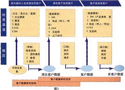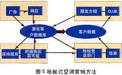 ——銷售支持:東京煤氣公司擁有三種主要的家用產(chǎn)品:地板式空調(diào),煤氣暖氣及煤氣衣服干燥機。此公司于1993年開始運用數(shù)據(jù)庫營銷,現(xiàn)已取得了驕人的成果。其中主力產(chǎn)品——地板式空調(diào),盡管周期長、價格高,1997年一年就銷售了3萬6千套,同時從對這些用戶調(diào)查的結(jié)果發(fā)現(xiàn)“滿意”的占96%。下面介紹一下“地板式空調(diào)”的營銷方法(見圖5)