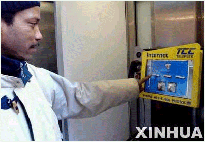 在美國紐約曼哈頓,一名男子正在使用網(wǎng)絡公用電話。美國第一部戶外網(wǎng)絡公用電話2月10日在紐約街頭開始試用。