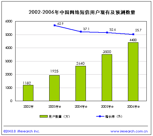根據(jù)iResearch調(diào)查2002年網(wǎng)絡短信用戶為1182萬,占網(wǎng)民總數(shù)的20%,2003年達到1925萬,增長率為62.9%,預計到2006年將達4400萬,有30%的網(wǎng)民會使用網(wǎng)絡短信,網(wǎng)絡短信市場將具有非常廣泛的用戶基礎。