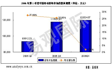 新華美通消息:易觀國際研究表明,2006年第一季度,CRBT 業(yè)務(wù)整體市場(chǎng)規(guī)模達(dá)到16億元,環(huán)比增長率為5%,增長速度較上個(gè)季度大幅度下降,業(yè)務(wù)已經(jīng)進(jìn)入低級(jí)飽和期。其中中國移動(dòng)的彩鈴業(yè)務(wù)的市場(chǎng)規(guī)模環(huán)比增長率僅僅為2%,如果扣除中國移動(dòng)和中央電視臺(tái)合作進(jìn)行的春晚彩鈴業(yè)務(wù)收入,中國移動(dòng)彩鈴業(yè)務(wù)市場(chǎng)規(guī)模實(shí)際略有下降。