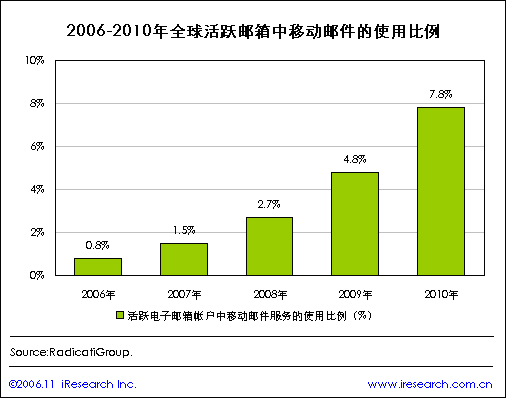 iResearch艾瑞市場咨詢根據(jù)市場咨詢公司RadicatiGroup公布的調(diào)查結(jié)果整理顯示,在2006年全球活躍電子郵箱賬號中有0.8%使用移動(dòng)電子郵件服務(wù),移動(dòng)電郵將會逐漸為高端用戶所接受,RadicatiGroup預(yù)計(jì)到2010年活躍電子郵箱賬號中使用移動(dòng)電郵服務(wù)的比例將達(dá)到7.8%.