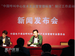 2月7日,中國電子商會呼叫中心與客戶關(guān)系管理專業(yè)委員會(CNCCA)在北京信息產(chǎn)業(yè)部萬壽路辦公區(qū)召開“中國呼叫中心技術(shù)及運營管理規(guī)范”制訂工作啟動新聞發(fā)布會。在京各主要新聞媒體高度關(guān)注在國家宏觀政策轉(zhuǎn)向服務外包的大背景下,呼叫中心中國標準的出臺將為產(chǎn)業(yè)的發(fā)展和國際競爭格局的變化帶來如何的影響。呼叫中心行業(yè)各知名廠商、運營商、服務提供商代表出席新聞發(fā)布會。會議同時發(fā)布了《2007年中國呼叫中心運營標桿管理報告》。