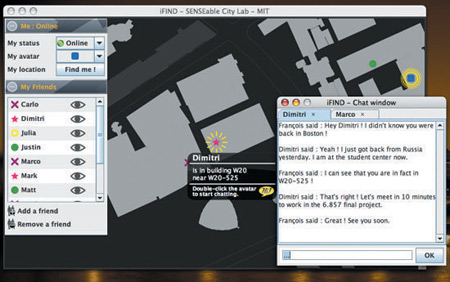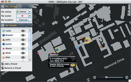 該軟件名為iFind,乍一看類似任何典型的即時(shí)通信軟件,也需要雙方相互邀請(qǐng),這樣才能進(jìn)入對(duì)方的好友名單。用戶可以選擇暫時(shí)隱藏起來(lái),不讓某個(gè)好友或者整個(gè)群組看見(jiàn)自己,他們還可以完全把某人從好友名單中刪除。不過(guò)iFind的好友名單增加了地圖,可以實(shí)時(shí)顯示這些朋友在MIT校園的哪個(gè)角落。地圖顯示了通過(guò)Wi-Fi登錄到MIT網(wǎng)絡(luò)上的好友,讓用戶可以為每個(gè)朋友創(chuàng)建獨(dú)特的迷你頭像,能看到誰(shuí)在學(xué)校河邊閑逛、誰(shuí)在樓上圖書(shū)館看書(shū)。