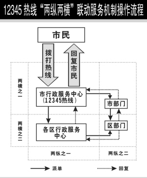 為了保證熱線順利開通提供優(yōu)質(zhì)服務(wù),有關(guān)方面還建立了“兩縱兩橫”聯(lián)動服務(wù)機(jī)制!皟煽v”即市行政服務(wù)中心與各區(qū)行政服務(wù)中心之間的縱向聯(lián)系,市級熱線成員單位與區(qū)級熱線成員單位之間的縱向聯(lián)系;“兩橫”即市行政服務(wù)中心與市級熱線成員單位的橫向聯(lián)系,各區(qū)行政服務(wù)中心與區(qū)級熱線成員單位之間的橫向聯(lián)系。