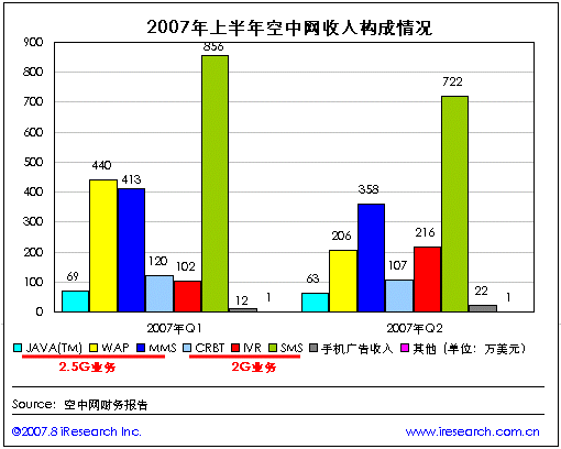 空中網(wǎng)2007年第二季度財報數(shù)據(jù)顯示,第二季度空中網(wǎng)的總收入1695.9萬美元,同比負增長43.6%,環(huán)比負增長15.7%。與第一季度相比在空中網(wǎng)兩個產(chǎn)品平臺的主要2G業(yè)務和2.5G的業(yè)務收入都出現(xiàn)了不同程度的下降,但2G業(yè)務中的IVR業(yè)務收入則出現(xiàn)了大幅上升。