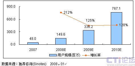預(yù)計2008年,在3G和奧運這兩大利好因素的拉動下,中國3G視頻應(yīng)用市場規(guī)模將從2007年的233.7億元增長123%,達(dá)到521.4億元,用戶規(guī)模將從2007年的4800萬人增長212%,達(dá)到14960萬人。市場規(guī)模和用戶規(guī)模增長率都將在奧運會期間達(dá)到高峰。