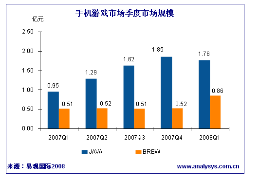 2008年第1季度中國JAVA/BREW手機(jī)游戲市場規(guī)模達(dá)2.61億人民幣