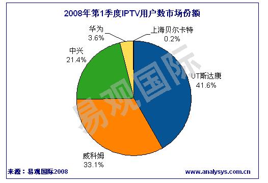 《2008年第1季度中國(guó)IPTV市場(chǎng)季度監(jiān)測(cè)》數(shù)據(jù)顯示,2008年第1季度中國(guó)IPTV累計(jì)用戶數(shù)達(dá)131萬人。根據(jù)各廠商中標(biāo)業(yè)務(wù)區(qū)實(shí)際發(fā)展的用戶數(shù)排名,UT斯達(dá)康、威科姆、中興通訊位居前三。2008年第1季度IPTV廠商的競(jìng)爭(zhēng)格局沒有顯著變化。