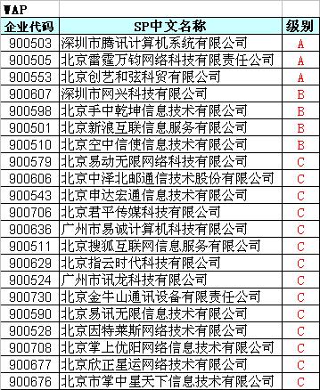 從榜單上可以看到,在短信業(yè)務上,北京星潮在線文化發(fā)展有限公司、北京雷霆萬鈞網絡科技有限責任公司和南京網典科技有限公司獲A評級。深圳市騰訊計算機系統(tǒng)有限公司、北京雷霆萬鈞網絡科技有限責任公司和北京創(chuàng)藝和弦科貿有限公司獲得WAP業(yè)務的A評級。