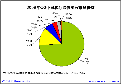 根據(jù)iResearch艾瑞咨詢最新出版的《2008年第三季度中國移動增值行業(yè)發(fā)展報(bào)告》數(shù)據(jù)顯示,2008年第三季度中國移動增值服務(wù)市場規(guī)模達(dá)332.4億元,同比增長40.2%.其中短信市場規(guī)模以74.0%的比例位居第一,CRBT和WAP分別以12.9%和6.2%的份額居第二、第三。