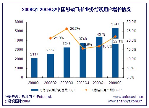 飛信用戶到達(dá)數(shù)的增長帶來了活躍用戶的穩(wěn)步提升,截止到2009年第2季度,飛信活躍用戶達(dá)到了5347萬,與2008年同期相比增長超過108.3%。由于一方面飛信到達(dá)數(shù)增長環(huán)比從2008年第2季度持續(xù)下跌,在2009年第2季度才止跌反彈,相比另一方面飛信活躍用戶的增長環(huán)比始終保持在15%以上,且從2008年第4季度開始飛信活躍用戶增幅持續(xù)擴(kuò)大,因此近期飛信業(yè)務(wù)用戶活躍度表現(xiàn)出良好的增長勢頭。