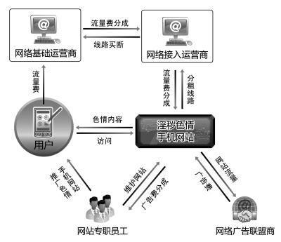以包裝成彩鈴的標價2塊錢的淫穢色情視頻為例,用戶下載后,電信運營商就會從上網的手機賬號上扣掉2元錢,之后電信運營商就會按照與增值服務商的分成協(xié)議規(guī)定,按一定比例與增值服務商進行分成,比如按3:7進行分成,電信運營商就會將2元錢中的0.6元留為已有,將剩余的1.2元交給增值服務商,增值服務商再將1.2元中的一部分按比例分給內容提供商。在這個過程中,電信運營商不僅獲得了增值服務分成的錢,而且由于提供了上網服務,還會從手機用戶那里收取下載彩鈴所需要的數據流量費。