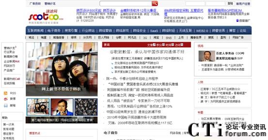 CTI論壇(ctiforum)1月11日消息(記者 張塵):近日,記者獲悉,原天極傳媒集團(tuán)副總裁、資深媒體人士范鋒正式宣布創(chuàng)業(yè),同時(shí),其所創(chuàng)辦的Web2.0媒體速途網(wǎng)(www.sootoo.com)于今日正式上線。在經(jīng)過(guò)近9個(gè)月的低調(diào)測(cè)試之后,定位于“中國(guó)互聯(lián)網(wǎng)行業(yè)媒體和在線服務(wù)平臺(tái)”的速途網(wǎng)今天以全新版式亮相。