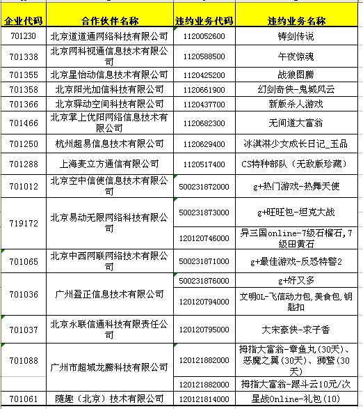 依據省移動公司上報調查發(fā)現,下列合作伙伴存在違約行為,依據《中國移動游戲業(yè)務合作伙伴信用積分管理辦法V2.0》,處理如下: