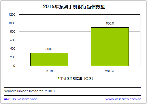 艾瑞咨詢根據(jù)Juniper Research發(fā)布的預(yù)測數(shù)據(jù)發(fā)現(xiàn),由于新類型的手機(jī)銀行短信提醒的應(yīng)用,到2015年,全球手機(jī)銀行短信量將達(dá)到900億條每年,相當(dāng)于每個手機(jī)銀行用戶每隔一天就會收到一條銀行發(fā)來的信息。