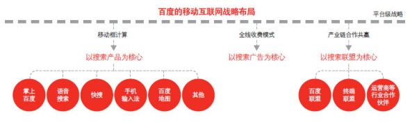 百度無(wú)線(xiàn)的戰(zhàn)略仍將以搜索作為核心。“百度在無(wú)線(xiàn)方面的核心發(fā)展規(guī)劃就三條:第一條,以搜索產(chǎn)品為核心布局移動(dòng)框計(jì)算。第二條,以搜索廣告位核心,探索全線(xiàn)收費(fèi)模式。第三條,以搜索聯(lián)盟為核心,推動(dòng)產(chǎn)業(yè)鏈合作共贏!边@是百度的官方說(shuō)法。