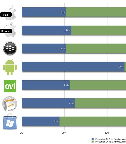 Windows市場中的免費應用程序比例最少,僅占其應用程序總量的22%;其次為蘋果iPad應用程序商店,其免費應用程序比例為26%。iPhone應用程序商店中,免費應用程序的比例為29%。在付費應用程序方面,Android市場及Palm公司應用程序商店中前100名熱銷應用程序價格平均值高于所有收費應用程序價格均值。