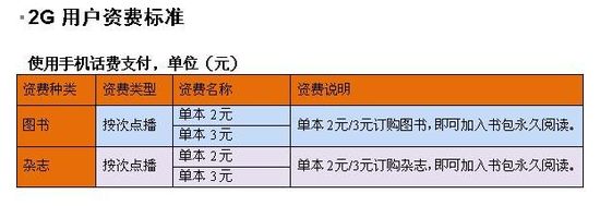 據(jù)了解,中國(guó)聯(lián)通手機(jī)閱讀業(yè)務(wù)只針對(duì)聯(lián)通網(wǎng)內(nèi)手機(jī)用戶,采用按次點(diǎn)播(按本訂購(gòu))的資費(fèi)標(biāo)準(zhǔn)。同時(shí),2G用戶和3G用戶采用不同的支付方式,2G用戶使用手機(jī)話費(fèi)支付,3G用戶使用M/T支付。