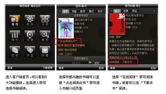 據(jù)了解,中國(guó)聯(lián)通手機(jī)閱讀業(yè)務(wù)分為三個(gè)專區(qū)。目前,圖書頻道包括16類24000余本圖書,雜志頻道包括17類500余本雜志。此外,用戶可選擇進(jìn)入聽書頻道,下載并收聽圖書。