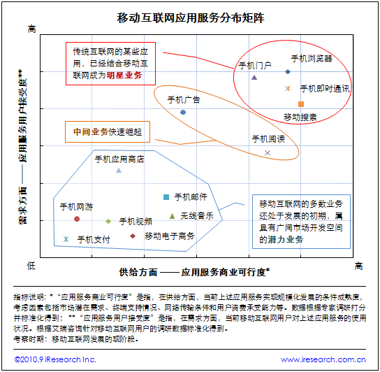 根據(jù)艾瑞咨詢近期發(fā)布的《2009-2010年中國移動互聯(lián)網行業(yè)發(fā)展報告》,移動互聯(lián)網各應用服務在“應用服務商業(yè)可行度”和“應用服務用戶接受度”兩個維度上被劃分為“明星業(yè)務”、“中間業(yè)務”和“潛力業(yè)務”三個類型。具備一定規(guī);l(fā)展市場條件,但還面臨若干限制因素的移動互聯(lián)網業(yè)務,將在未來逐步打開市場。