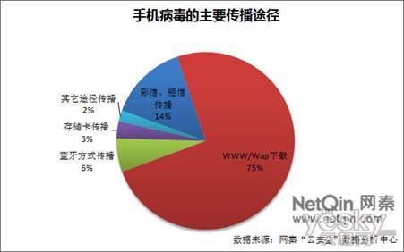 感染途徑方面,《2010年中國大陸地區(qū)手機安全報告》指出,據(jù)網(wǎng)秦“云安全”數(shù)據(jù)分析中心統(tǒng)計,當前通過手機訪問wap和www網(wǎng)站感染病毒的比率達75%;通過短信、彩信感染病毒的比率占14%;通過藍牙傳輸方式感染病毒的比率占6%;通過存儲卡等途徑感染病毒的比率占3%;另外2%的用戶則是被其它傳播途徑的病毒感染。其中聯(lián)網(wǎng)感染病毒的機率最大,成為用戶面臨的最主要威脅。