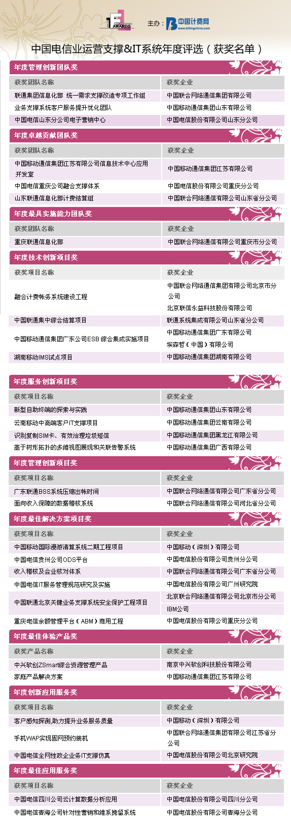 由中國計費(fèi)網(wǎng)(www.billingchina.com)主辦的“Awards2010”第四屆中國電信業(yè)運(yùn)營支撐&IT系統(tǒng)年度評選活動的結(jié)果于2011年元月31日隆重揭曉。自2010年12月1日評選活動正式啟動以來,歷時兩個月,來自國內(nèi)運(yùn)營商集團(tuán)、省級公司、IT產(chǎn)品與服務(wù)提供商的42家企業(yè)的優(yōu)秀產(chǎn)品、項目和團(tuán)隊共計70份參評項目入圍評選。經(jīng)過全面征集、選拔、初審以及評委團(tuán)的嚴(yán)格評審,評選結(jié)果已經(jīng)公示。在30位來自運(yùn)營商IT支撐、業(yè)務(wù)和服務(wù)部門的威權(quán)評委們的認(rèn)真評審后,共有27家企業(yè)分別獲得了30個Awards2010的團(tuán)隊/項目/產(chǎn)品/應(yīng)用服務(wù)的榮譽(yù)桂冠。