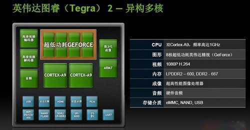 而英偉達(dá)圖睿Tegra 2就是專為移動市場而設(shè)計的超級芯片,Tegra 2雙核處理器采用了40納米工藝制程,有兩顆Cortex-A9處理器,主頻高達(dá)1GHz。Tegra 2處理器芯片只有1/4個硬幣大小,雙核以更低的功耗實現(xiàn)同等性能,多任務(wù)處理速度提升一倍,尤其是處理Flash以及HTML5的速度最快。