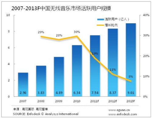2011年整體無線音樂市場格局仍會保持相對穩(wěn)定。但整體市場規(guī)模,及無線音樂用戶數(shù)的增速會略有下降。易觀國際(Analysys International)預(yù)計2013年收入規(guī)模達到400個億,2013年無線音樂活躍用戶達到9.95億人。