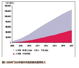 由于新興市場(chǎng)的固網(wǎng)寬帶資源相對(duì)短缺,因此這些地方移動(dòng)寬帶替代固定寬帶的可能性將非常大。同時(shí),由于大屏幕移動(dòng)寬帶終端(便攜式電腦、上網(wǎng)本、平板電腦)一般比小屏幕終端的價(jià)格要高,因此我們認(rèn)為小屏幕終端將主導(dǎo)新興市場(chǎng),到2015年77%的移動(dòng)寬帶連接將基于小屏幕終端進(jìn)行(見圖2)。