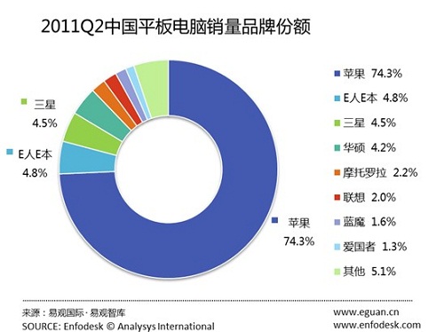 CTI論壇(ctiforum)7月21日消息(記者 楊佳林):根據(jù)易觀智庫最新數(shù)據(jù)顯示,在2011年第2季度蘋果iPad市場(chǎng)銷量份額環(huán)比下滑5.14%,至74.30%。其次是E人E本,占據(jù)了4.82%。三星位列第三。伴隨品牌平板電腦集體上市,以愛國者、藍(lán)魔為代表的消費(fèi)類電子廠商的平板電腦均收到一定影響,市場(chǎng)銷量和份額均有不同程度下降。