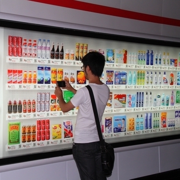 這種虛擬商店消費(fèi)模式如今正漂洋過海而來,北京移動此前就曾推出過麥當(dāng)勞電子兌換單服務(wù),用戶可以通過短信接收二維碼,再去麥當(dāng)勞門店掃描兌現(xiàn)。而細(xì)心的申城用戶如今也能在軌交過道中發(fā)現(xiàn)這樣的虛擬百貨商店廣告,這些燈箱廣告中出現(xiàn)了超市中才能見到的商品貨架,五顏六色的商品圖案讓人仿佛置身于大型超市一樣,但只有當(dāng)你走近才會發(fā)現(xiàn)“貨架”竟然是“貼”在墻上的,從零食到衣服,甚至還有尿片,這里每一種產(chǎn)品下方都有相應(yīng)價格和二維碼。