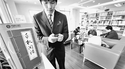 2010年4月16日下午,國內(nèi)首個(gè)G3閱覽室在杭州市下城區(qū)圖書館內(nèi)建成并免費(fèi)開放,實(shí)現(xiàn)了移動(dòng)信息技術(shù)與公共圖書館的有機(jī)結(jié)合。圖為讀者正在G3閱覽室里通過G3手機(jī)閱讀器免費(fèi)閱讀。