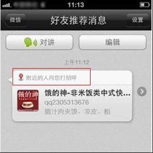 最近,網絡上流傳著這樣一幅截圖:一家叫“餓的神”的快餐店在午間向附近的人打招呼,以宣傳自己的快餐生意,乍一看這種形式,簡直是超越了空間的電子傳單啊。看來微信這種交友利器,已經突破了傳統(tǒng)交流工具的定義,開始向更寬的領域延伸。