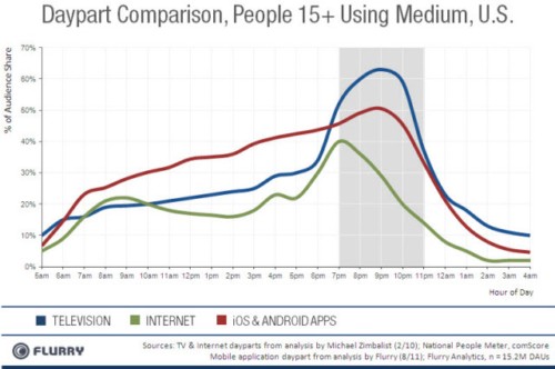 移動分析公司Flurry的一項最新研究表明,和電視節(jié)目有黃金收視時段一樣,移動應用也有黃金使用時段,晚上7點左右是用戶使用移動應用的頂峰期。