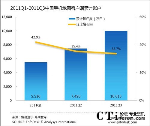 2011年第3季度中國手機地圖客戶端累計帳戶過億