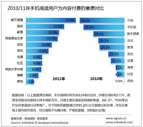 據(jù)易觀國際(Analysys International)《2011年中國手機閱讀市場用戶研究報告》研究發(fā)現(xiàn),2011年整體手機閱讀市場付費意愿有所降低。