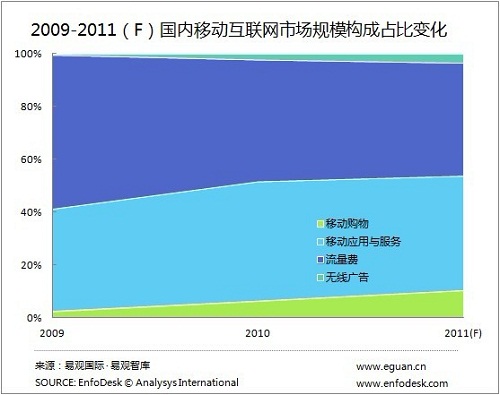 對比2009年到2011年市場規(guī)模的構(gòu)成變化可以了解到,2011年移動購物與無線廣告在規(guī)模占比上都有了很大的提高,尤其是移動購物,從2009年的規(guī)模占比3%增長到11%,用戶對通過移動終端購物的習(xí)慣整逐步被得到培養(yǎng),另外值得注意的是2011年移動互聯(lián)網(wǎng)流量費占比低于50%,已經(jīng)從2009的58%減少至42%。