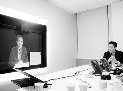 圖:Orange網(wǎng)絡(luò)解決方案業(yè)務(wù)部副總裁Nicolas Roy在巴黎演講,Orange中國(guó)區(qū)首席技術(shù)官劉昕(右)在主持北京視頻會(huì)議現(xiàn)場(chǎng)