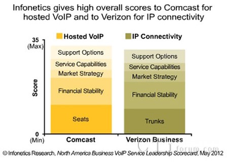 Infonetics Research公司VoIP 和IMS主要分析師Diane Myers 表示:“Comcast公司收購了New Global Telecom,前者在我們企業(yè)VoIP平衡記分卡中常年領(lǐng)先,今年這個收購?fù)苿覥omcast公司在Infonetics的托管業(yè)務(wù)VoIP領(lǐng)導(dǎo)力計分卡中位于第一的位置,連續(xù)四年的排名中,Verizon Business公司在IP 互聯(lián)領(lǐng)導(dǎo)力平衡計分卡中處于第一的位置,其次是AT&T公司”