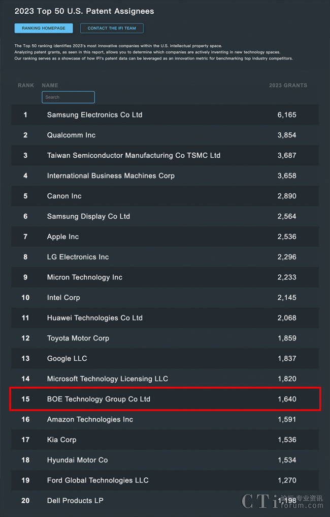 BOE(京東方)位列2023 IFI專利授權(quán)排行榜全球第15位