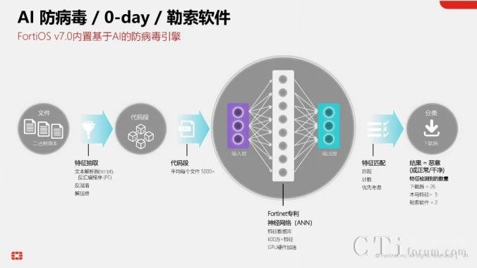 目前,AI技術(shù)已深度融入Fortinet的數(shù)十種產(chǎn)品與方案中。在最新版的統(tǒng)一網(wǎng)絡(luò)安全操作系統(tǒng)FortiOS 7.6中,就已經(jīng)內(nèi)置了由FortiGuard AI實(shí)驗(yàn)室研發(fā)的基于AI的防病毒引擎。該引擎運(yùn)用神經(jīng)網(wǎng)絡(luò)技術(shù),學(xué)習(xí)并區(qū)分海量病毒文件與正常文件,通過分類打分的方式,實(shí)現(xiàn)對(duì)未知文件與病毒的精準(zhǔn)判斷,無需依賴傳統(tǒng)的病毒特征庫。因此,F(xiàn)ortinet的FortiGate等產(chǎn)品在防病毒方面擁有雙引擎加持,既有傳統(tǒng)的基于病毒特征庫的防病毒引擎,又有基于AI的下一代防病毒引擎(Anti-virus NGAV),雙重保障,安全無憂。