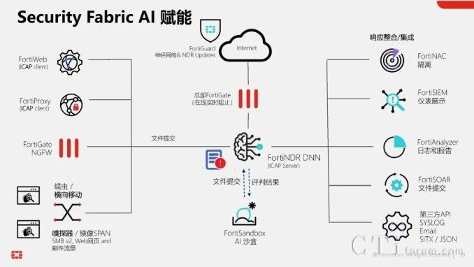 此外,AI技術(shù)還貫穿于Fortinet的多個(gè)產(chǎn)品與功能中,形成高效的工作流。以威脅檢測(cè)與響應(yīng)為例,當(dāng)FortiGate的雙引擎也無法確定某個(gè)文件的合法性時(shí),它可以將該文件提交給FortiNDR進(jìn)行深度分析,利用云端深度神經(jīng)網(wǎng)絡(luò)AI進(jìn)行0 Day攻擊、勒索軟件等深層次分析。若仍無法確定,還可進(jìn)一步提交給FortiSandbox,在虛擬機(jī)環(huán)境中進(jìn)行模擬操作,進(jìn)行更為深入的檢測(cè)。在這一系列流程與技術(shù)的支持下,F(xiàn)ortinet的威脅檢測(cè)與響應(yīng)能力已達(dá)到業(yè)界頂尖水平,向滿分100分邁進(jìn)。