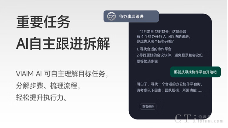 借助VIAIM AI智慧大腦,可一鍵提取會(huì)議摘要,海量會(huì)議內(nèi)容瞬間搞定,無(wú)需費(fèi)時(shí)手動(dòng)梳理;待辦事項(xiàng)自動(dòng)匯總,并可根據(jù)需求生成具體待辦子任務(wù),在執(zhí)行的過(guò)程中,科大訊飛降噪會(huì)議耳機(jī)Nano+會(huì)自主理解并分解目標(biāo)任務(wù)、理清流程,輕松提升執(zhí)行力。